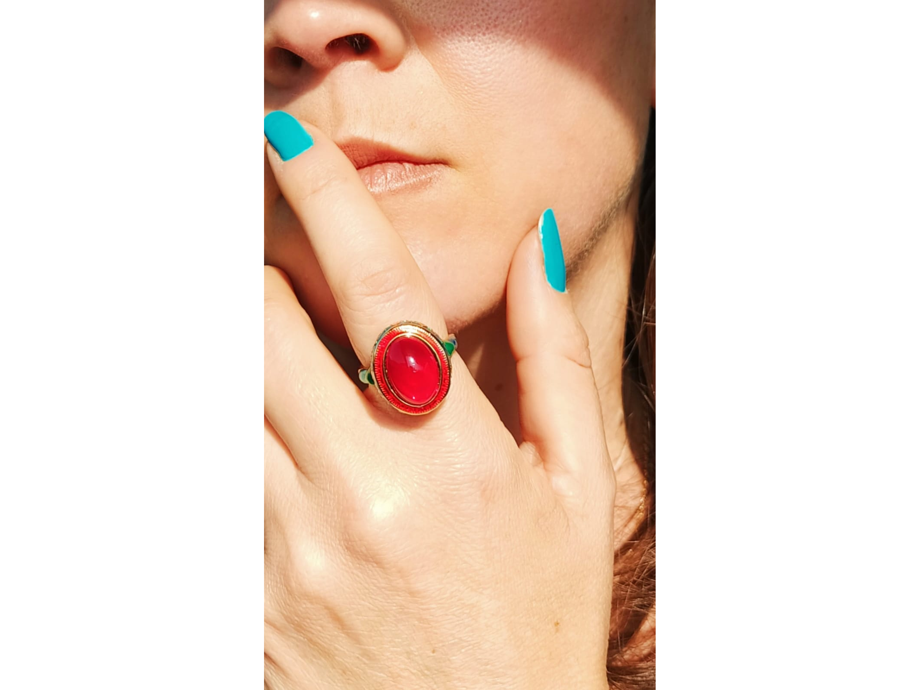 Hermosísimo anillo enchapado en oro 18k con una hermosa piedra central de cornalina roja intensa. Único y especial, se convierte en el regalo super ideal para ti ó para esa persona que precisamente tienes en mente.