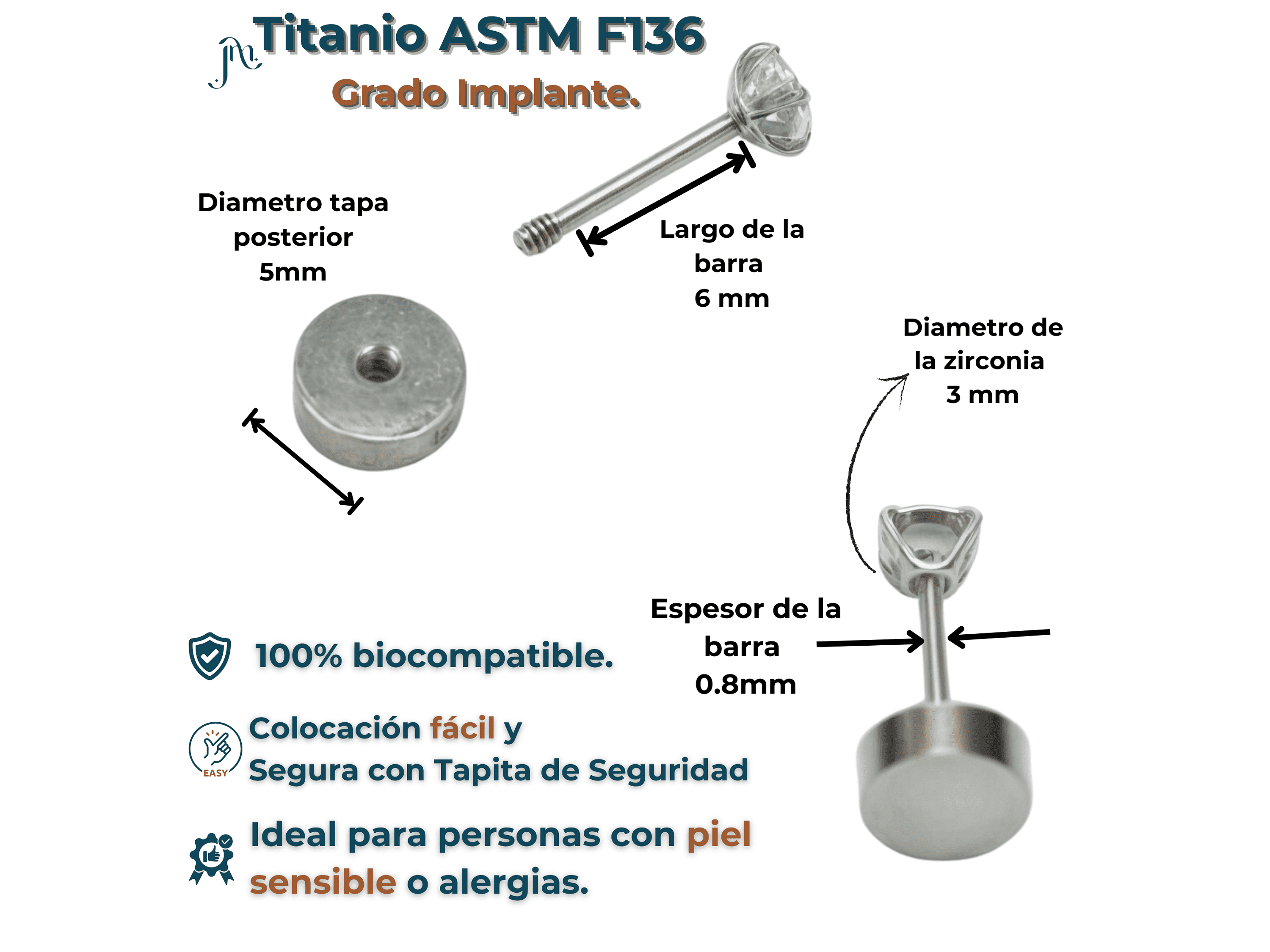 Medidas: Diametro zirconia 3mm x Largo de la barra 6mm x Espesor del vastago 0.8mm (20g)