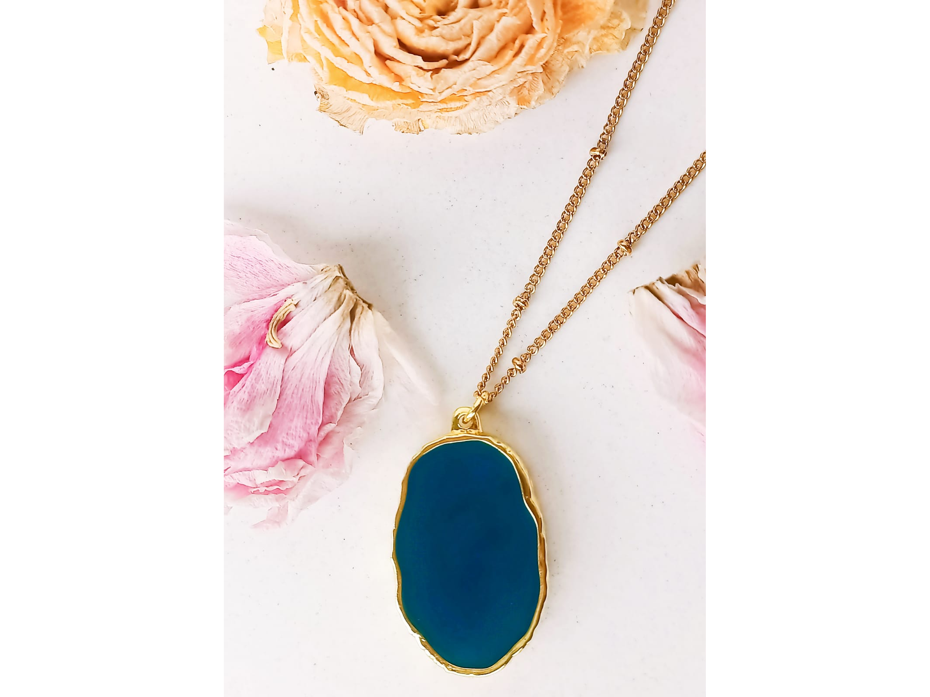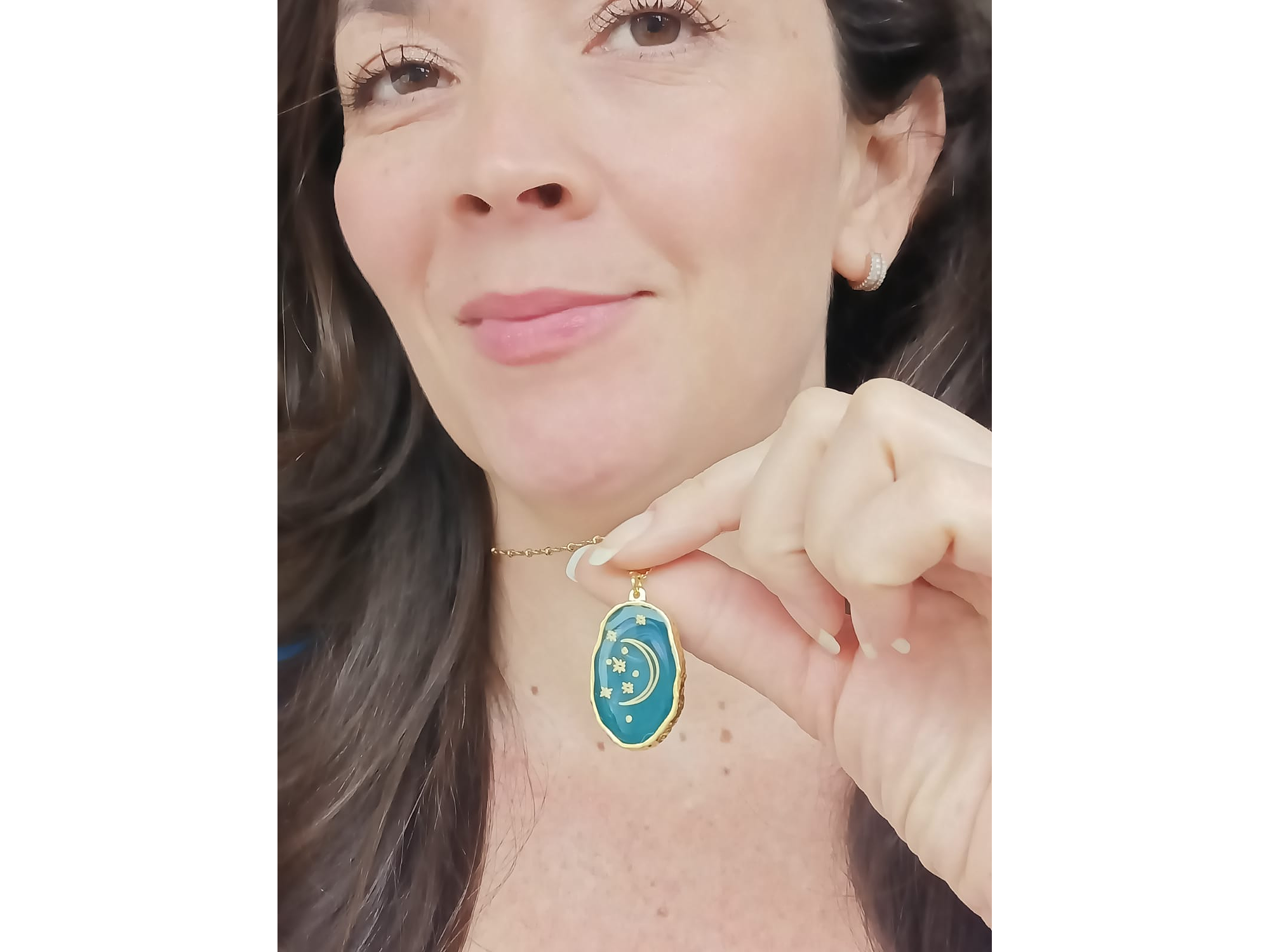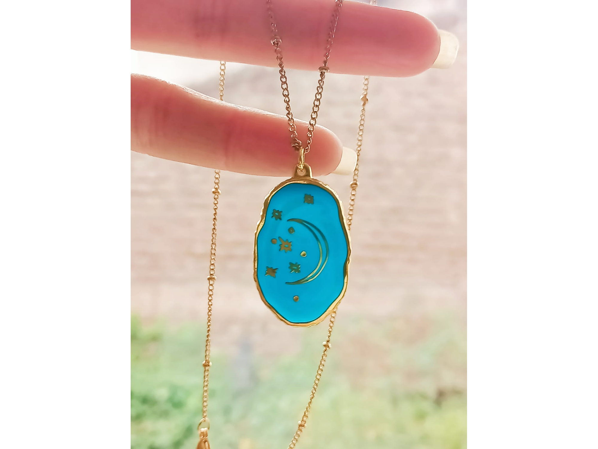 Hermoso colgante ovalado irregular con diseño de lunas y estrellas chapado en oro 18kl. Elaborado en resina color azul intenso con pintura de lunas y estrellas dibujadas a mano.