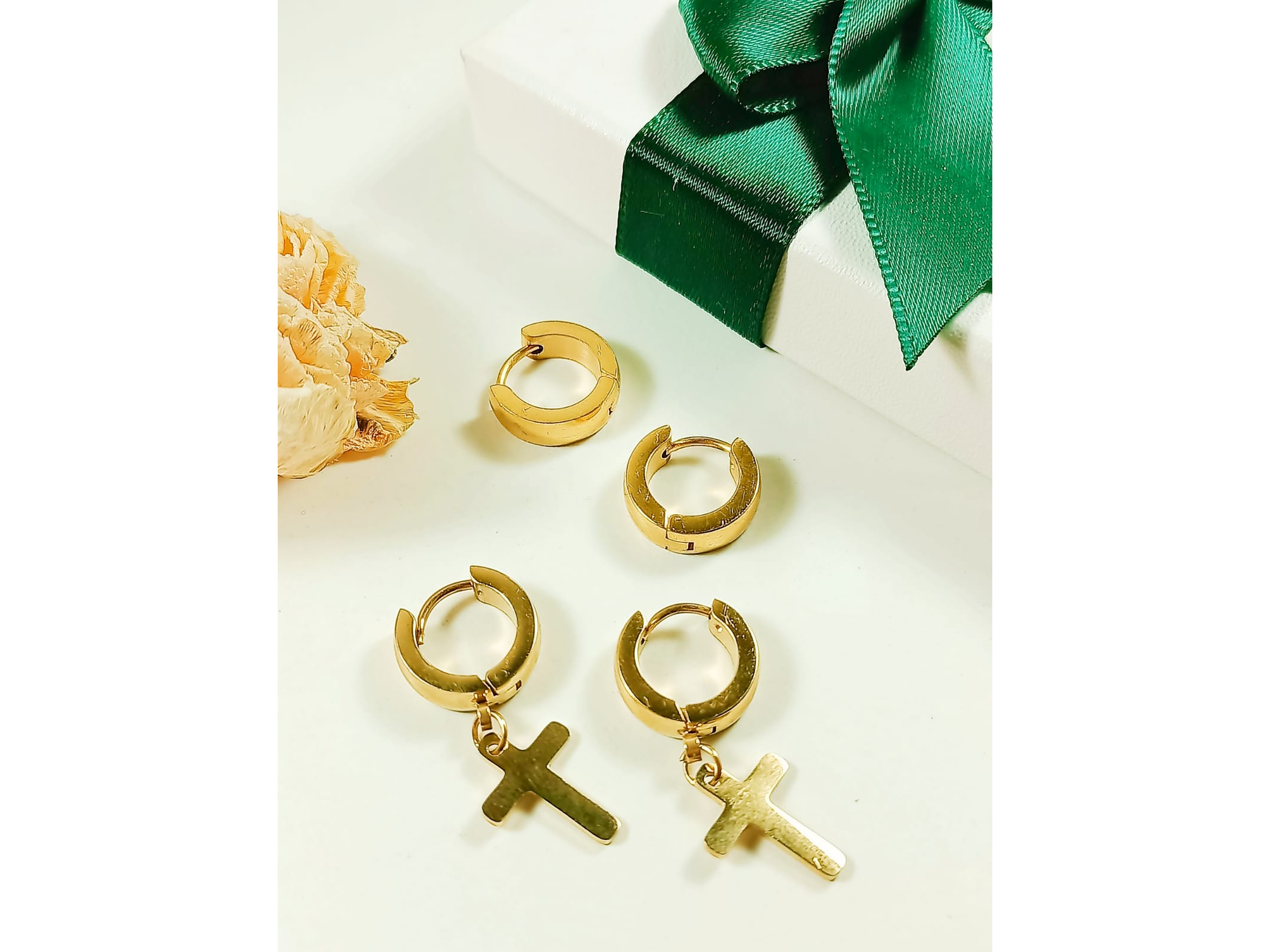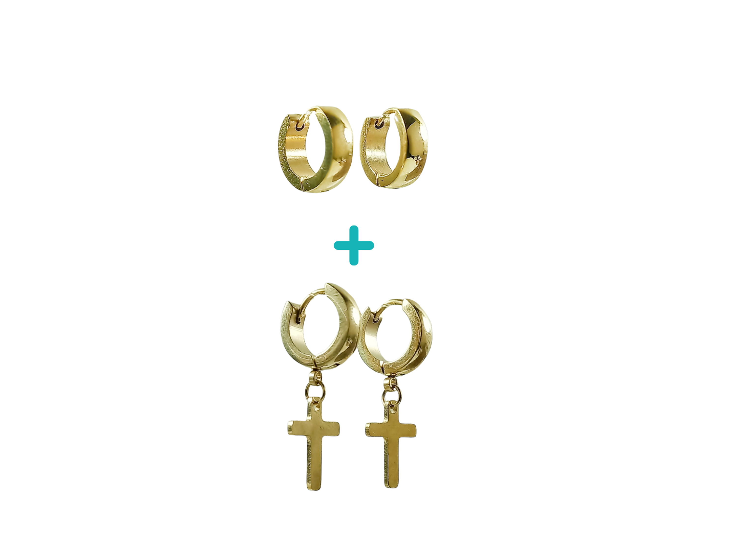 Bello pack o set de aros fabricados en acero inoxidable hipoalergenico. El pack consta de un par de argollas de 8mm de diámetro interno y una bella argolla de 8 mm de diametro interno la cual tiene cruz que cuelga de manera fija, ambas chapadas en oro 18k, formando ambas una combinación perfecta para tu piercing de orejas en tendencia.