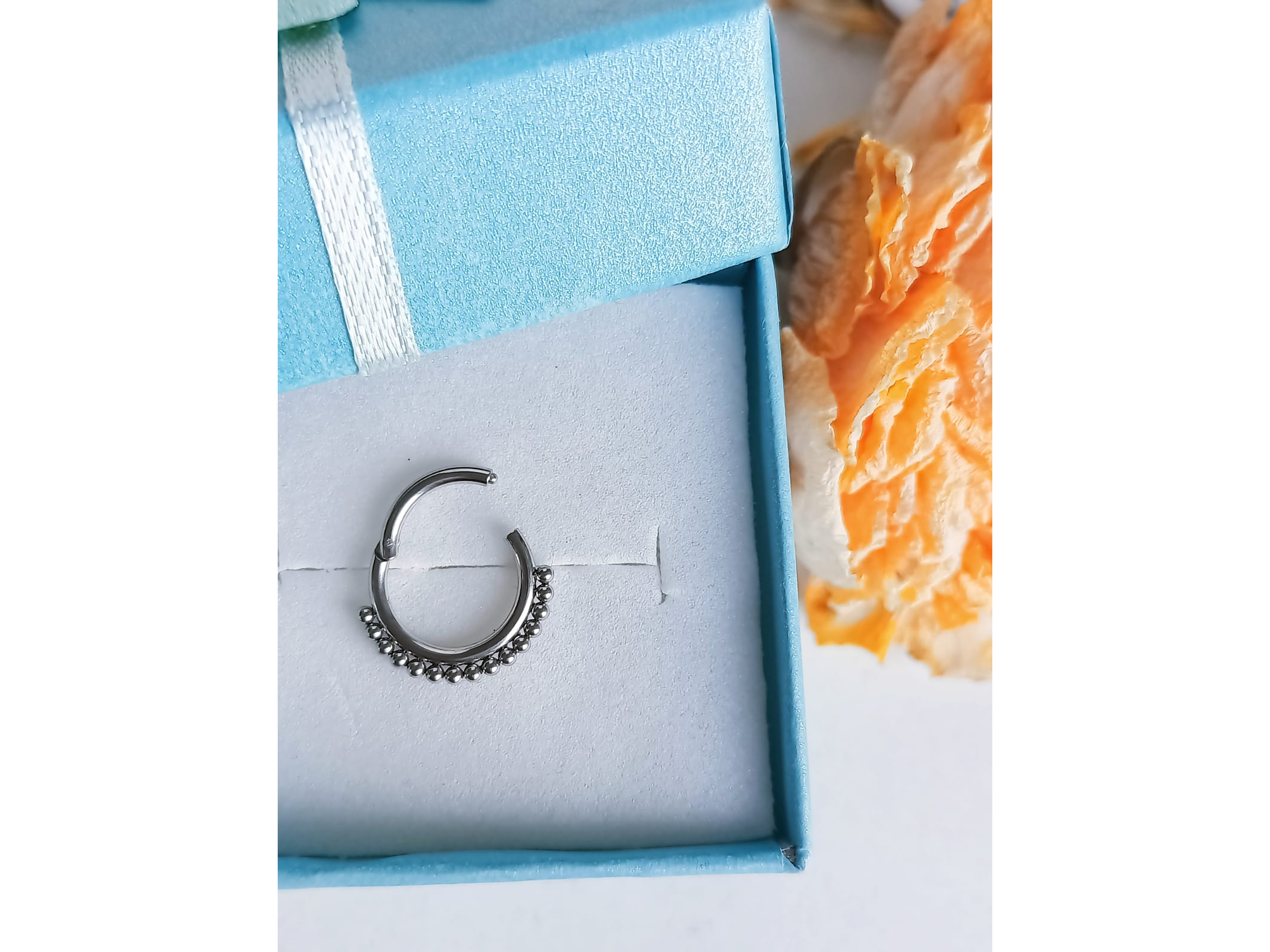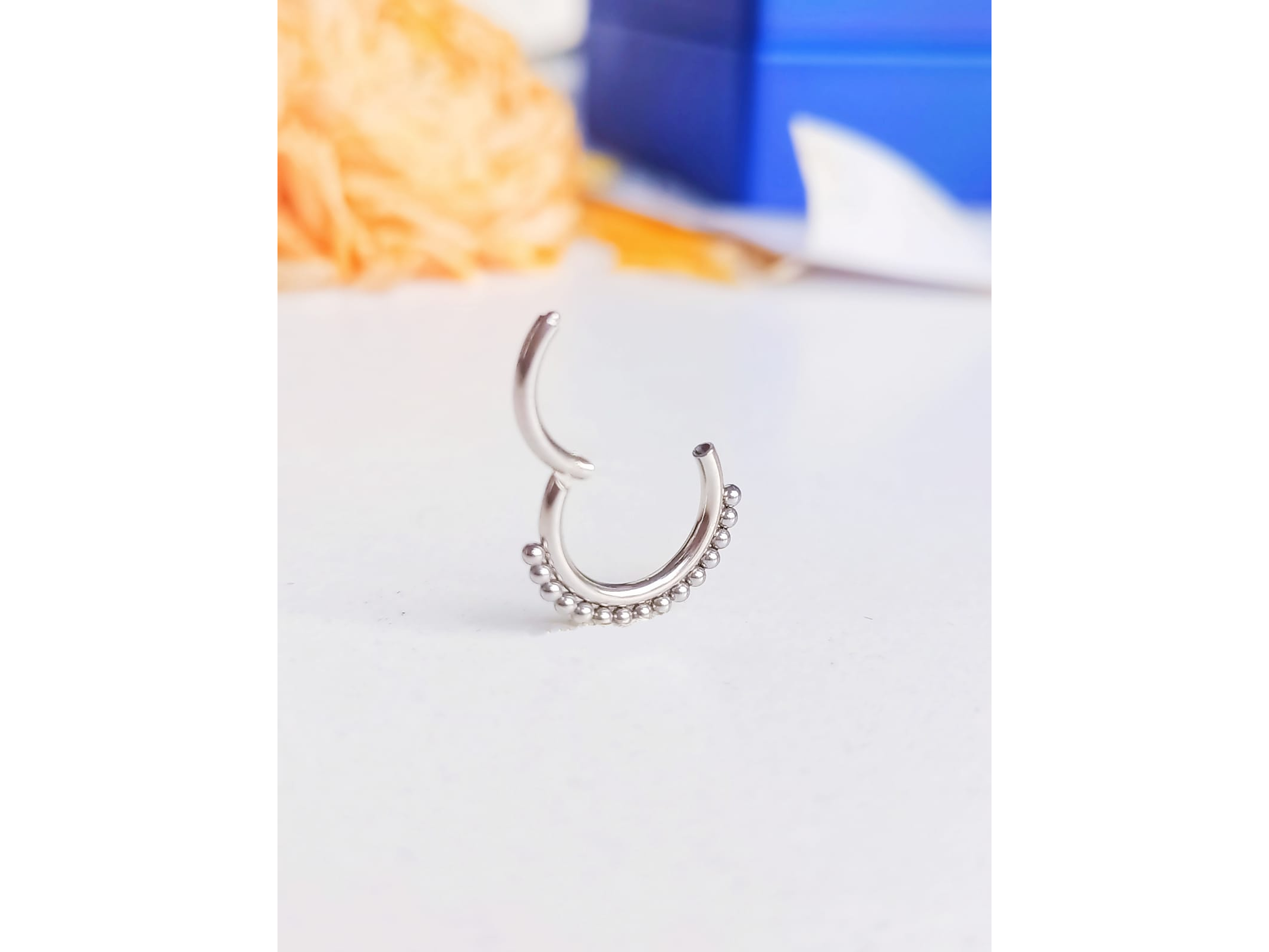 Perfecto Piercing Septum ó daith (para su uso en la nariz o la oreja). Fabricado en acero inoxidable quirurgico lo tenemos disponible en color plateado, decorados con bellas esferitas. Es importante que sepas que en el empaque viene 1 piercing.