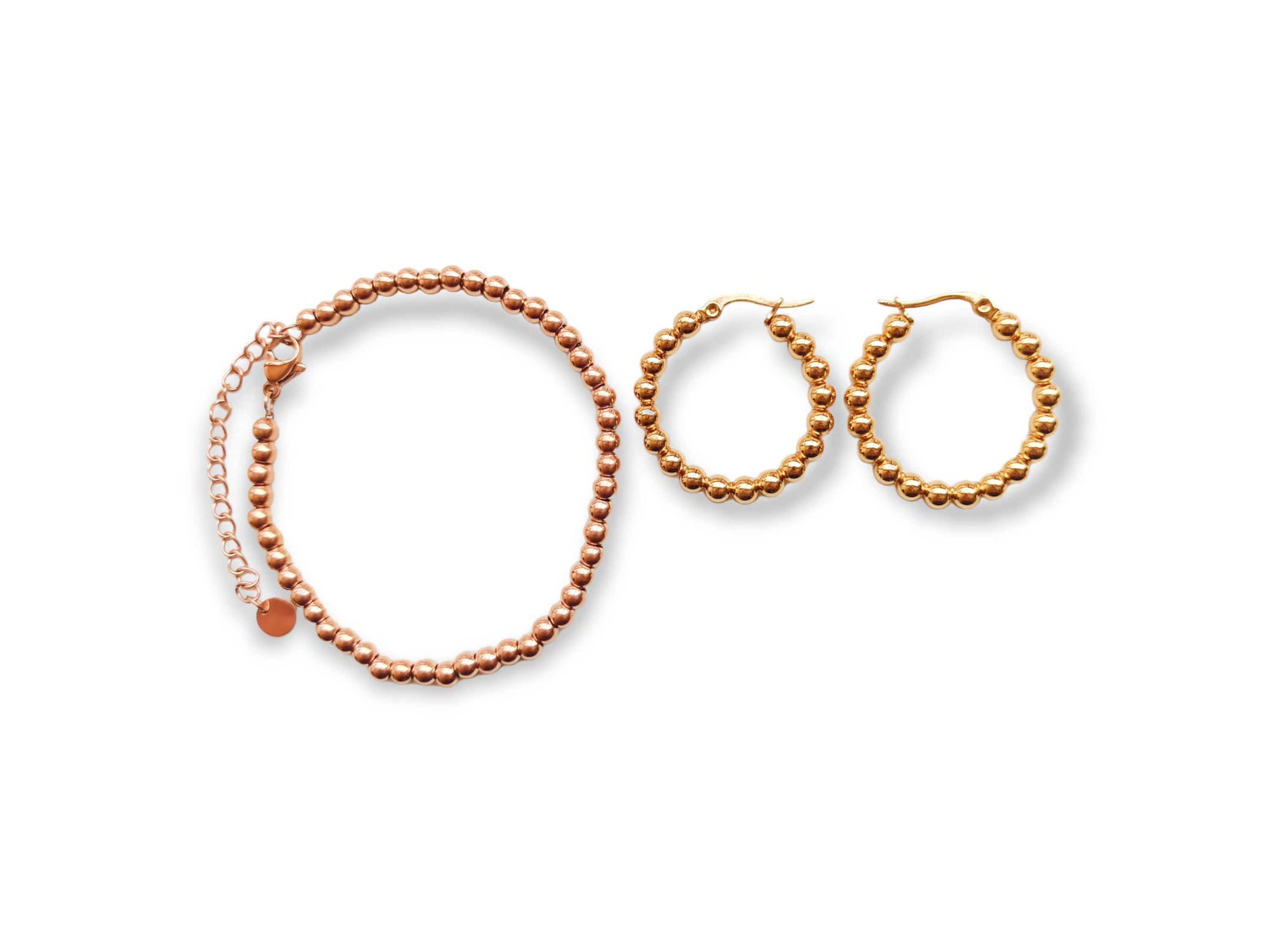 Hermoso set de aros y brazalete ó pulsera chapado en oro 18k. Este set posee la particularidad de contar con dos colores diferentes. Ambos están chapados en oro, sin embargo las argollas hoop cuentan con un chapado en oro dorado 18k que tiene un brillo muy especial y el brazalete cuenta con un hermoso chapado en oro rosa 18k ambos de una excelente calidad. A pesar de diferenciarse con dos colores, la belleza de portar este set radica en lo diferente y especial que es el degrade de oro rosa y oro dorado.